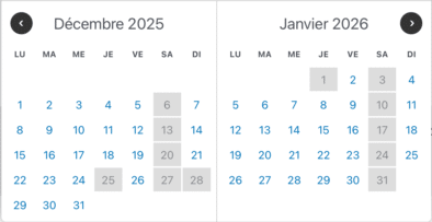 Les tarifs pour la période des Fêtes 2025-2026 seront en vigueur du mercredi 24 décembre 2025 au dimanche 4 janvier 2026. Les arrivées sont à 16h. Les arrivées tardives sont acceptées sous forme de rendez-vous. Les départs sont pour 11h. Durant cette période, les journées de départ ou d'arrivée doivent être le 24,26,29,30 et 31 décembre ou le 2 et 4 janvier 2026. Il est possible de prolonger le séjour au delà du 4 janvier ou commencer le séjour avant le 24 décembre tant que votre départ ou arrivée ne soit pas le 25,27 et 28 décembre 2025 ou le 1er et 3 janvier 2026. Voir le calendrier ci-dessous pour visualiser votre séjour. Les journées en gris sont les journées où il n'y a ni entrées, ni sorties.